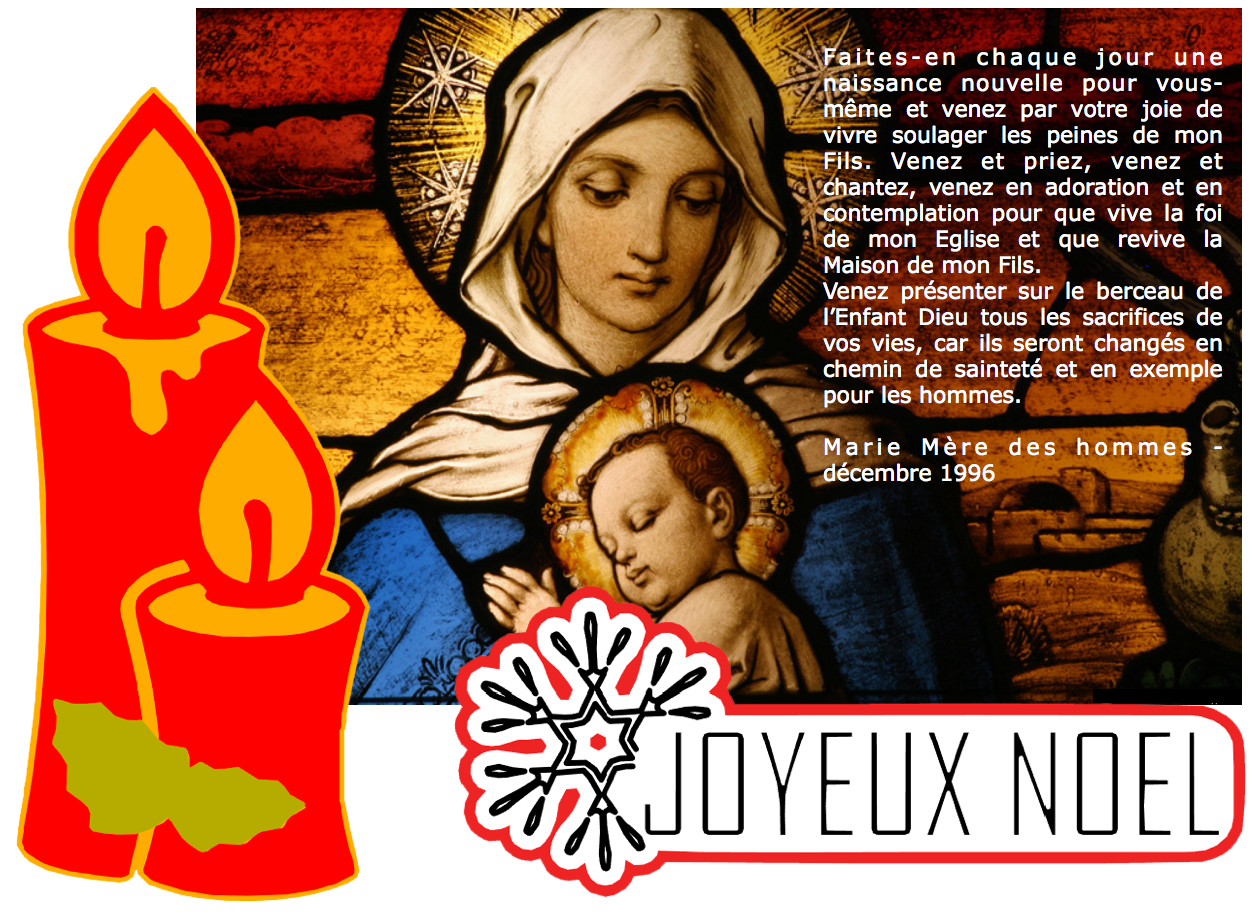 Mes enfants, la naissance est un acte de Joie, d’Amour et de Paix. Faites-en, chaque jour, une naissance nouvelle pour vous-même et venez par votre joie de vivre soulager les peines de mon Fils. Venez et priez, venez et chantez, venez en adoration et en contemplation pour que vive la foi de mon Eglise et que revive la Maison de mon Fils.