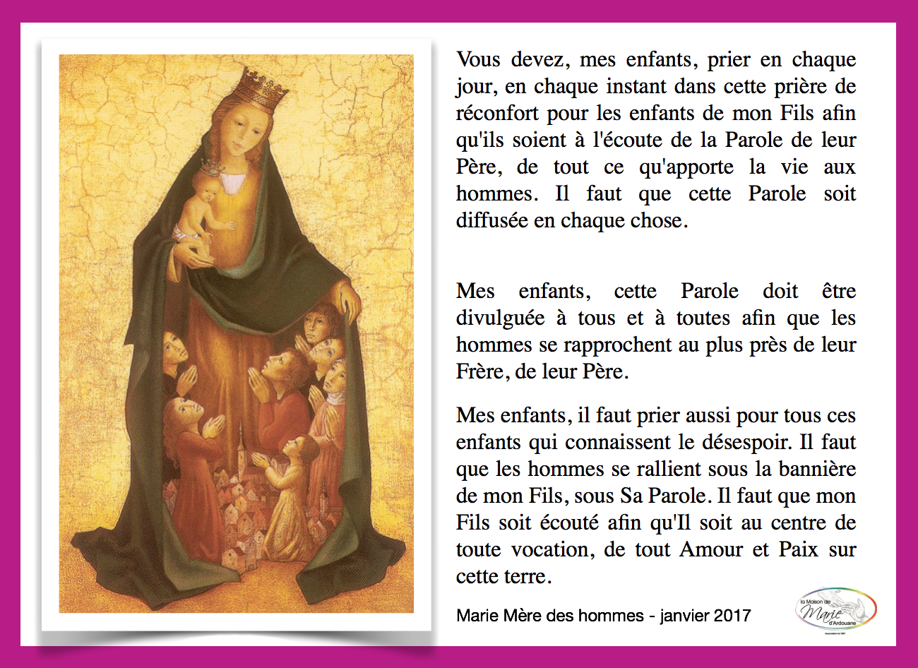 En union de prière, tous les vendredis soir, à la demande de Marie Mère des hommes, de 21h30 à 22h00.