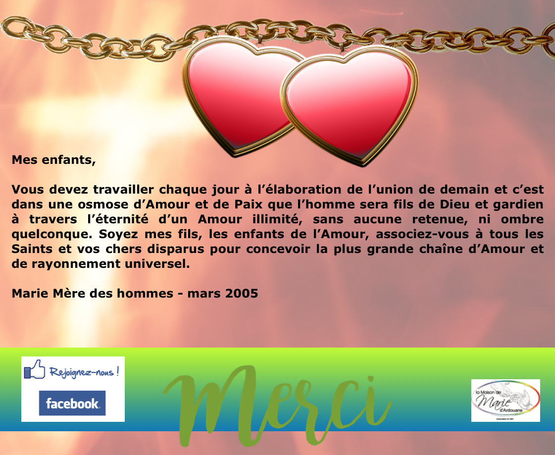 Mes enfants, vous devez travailler chaque jour à l’élaboration de l’union de demain et c’est dans une osmose d’Amour et de Paix que l’homme sera fils de Dieu et gardien à travers l’éternité d’un Amour illimité, sans aucune retenue, ni ombre quelconque. Soyez mes fils, les enfants de l’Amour, associez-vous à tous les Saints et vos chers disparus pour concevoir la plus grande chaîne d’Amour et de rayonnement universel.
