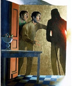 Quand ils approchèrent du village où ils se rendaient, Jésus fit semblant d’aller plus loin. Mais ils s’efforcèrent de le retenir : « Reste avec nous : le soir approche et déjà le jour baisse. » Il entra donc pour rester avec eux. Quand il fut à table avec eux, il prit le pain, dit la bénédiction, le rompit et le leur donna. Alors leurs yeux s’ouvrirent, et ils le reconnurent, mais il disparut à leurs regards. Alors ils se dirent l’un à l’autre : « Notre coeur n’était-il pas brûlant en nous, tandis qu’il nous parlait sur la route, et qu’il nous faisait comprendre les Écritures ? » A l’instant même, ils se levèrent et retournèrent à Jérusalem. Ils y trouvèrent réunis les onze Apôtres et leurs compagnons, qui leur dirent : « C’est vrai ! le Seigneur est ressuscité : il est apparu à Simon-Pierre. » A leur tour, ils racontaient ce qui s’était passé sur la route, et comment ils l’avaient reconnu quand il avait rompu le pain.