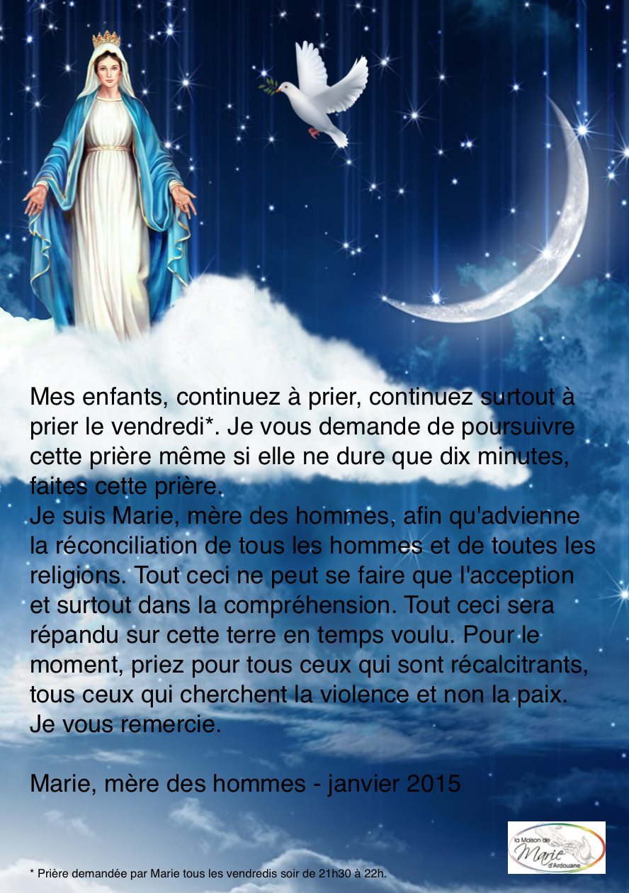 Je suis Marie, mère des hommes, afin qu’advienne la réconciliation de tous les hommes et de toutes les religions. Tout ceci ne peut se faire que l’acception et surtout dans la compréhension. Tout ceci sera répandu sur cette terre en temps voulu. Pour le moment, priez pour tous ceux qui sont récalcitrants, tous ceux qui cherchent la violence et non la paix. Je vous remercie.