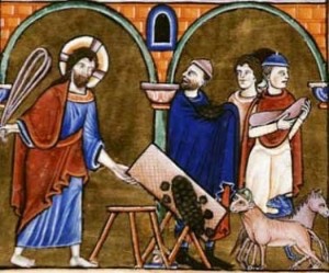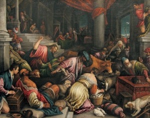 “Voici ce que j’enseigne: rendre la Maison de Dieu, maison de prière et non pas place d’usuriers et de marchands. Voilà mon enseignement.” Jésus est terrible. Il semble l’archange mis sur le seuil du Paradis perdu. Il n’a pas aux mains d’épée flamboyante mais ses yeux irradient la lumière et foudroient les moqueurs et les sacrilèges. A la main, il n’a rien. Seule sa sainte colère. Et avec elle, cheminant rapide et imposant au milieu des comptoirs, il éparpille les monnaies méticuleusement rangées selon leur valeur, renverse tables petites et grandes et tout tombe avec fracas sur le sol avec grand bruit de métaux qui rebondissent et de bois bousculés avec cris de colère, d’effarement et d’approbations. Puis il arrache des mains des gardiens de bestiaux des cordages qui attachaient bœufs, brebis et agneaux; il en fait un martinet très dur dont les nœuds coulants assemblent les lanières. Il se lève, le fait tournoyer et l’abaisse sans pitié. Oui, je vous l’assure, sans pitié. La grêle imprévue s’abat sur les têtes et les échines. Les fidèles s’esquivent, admirant la scène. Les coupables, poursuivis jusqu’en dehors de l’enceinte se sauvent à toutes jambes, laissant par terre l’argent et en arrière les bêtes de toutes tailles, dans une grande confusion de Jambes, de cornes, d’ailes. C’est à qui court, s’échappe en volant. Les mugissements, les bêlements, les roucoulements des colombes et des tourterelles en même temps que les rires et les cris des fidèles derrière les usuriers en fuite dépassent jusqu’au lamentable chœur des animaux qu’on égorge certainement dans une autre cour. Des prêtres accourent, en même temps que des rabbins et des pharisiens. Jésus est encore au milieu de la cour, revenant de sa poursuite. Il a encore en mains le martinet. “Qui es-tu? Comment te permets-tu de faire cela, en troublant les cérémonies prescrites? De quelle école proviens-tu? Pour nous, nous ne te connaissons pas. Nous ne savons pas qui tu es.” “Je suis Celui qui peut. Je peux tout. Détruisez seulement ce Temple vrai, et Je le ressusciterai pour donner louange à Dieu. Je ne trouble pas, Moi, la sainteté de la Maison de Dieu ni les cérémonies. Mais c’est vous qui la troublez en permettant que dans sa demeure s’installent les usuriers et les mercantis. Mon école, c’est l’école de Dieu, la même école qui fut celle de tout Israël, par la bouche de l’Éternel qui parlait à Moïse. Vous ne me connaissez pas? Vous me connaîtrez. Vous ne savez pas d’où je viens? Vous le saurez.”