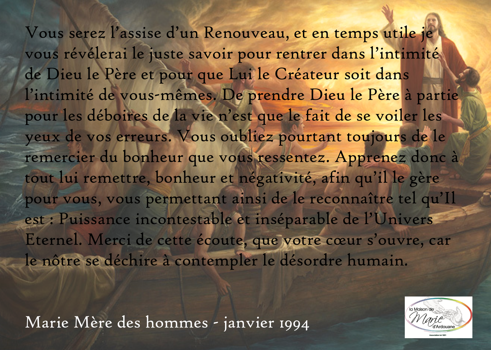 Mes enfants, vous manquez de réceptivité et d’ardeur à l’avancée de ma Maison, vous êtes tous concernés et ceci pour aider autrui. Venez enrichir les rangs de ceux qui désirent apporter leur pierre pour ériger cet édifice, havre de paix pour les êtres infortunés. Des êtres attendent cet évènement avec impatience, apportez avec exaltation vos bras au devenir de ma Maison.